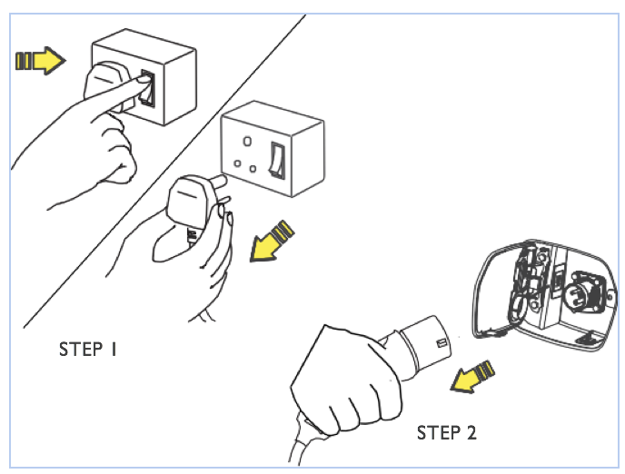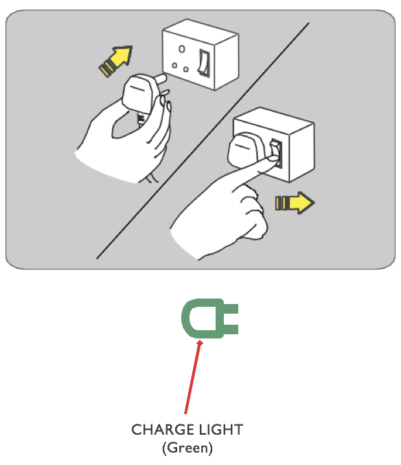 - TURNMAIN- Check for AC power supply at charge cable end indicated at switch when the power is on.